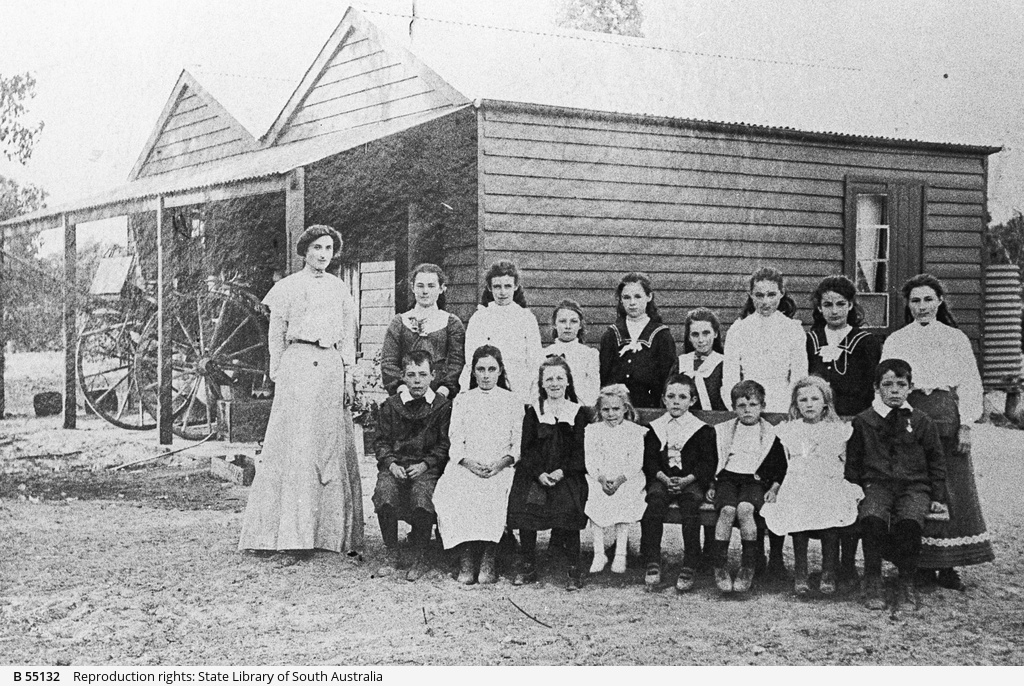 [1] Featured Imagine State Library of South Australia (approx 1905). Woman and children outside a building at Wangolina. (likely to be the school building)
