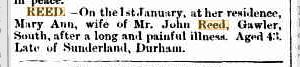 The REED family lived in Bishopwearmouth, County Durham prior to migrating to Australia. John and Mary Ann had six children prior to migrating in 1854 on the Dirigo to South Australia [3]. On the voyage with them were, John Henry born 7 May 1845 [4] and Margaret Ann born 13 March 1854 [5].