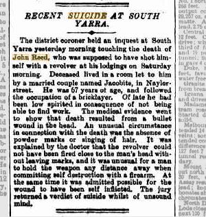 - RECENT SUICIDE AT SOUTH YARRA. (1891, March 17). The Age (Melbourne, Vic. : 1854 – 1954), p. 6. Retrieved February 17, 2019, from http://nla.gov.au/nla.news-article201452463