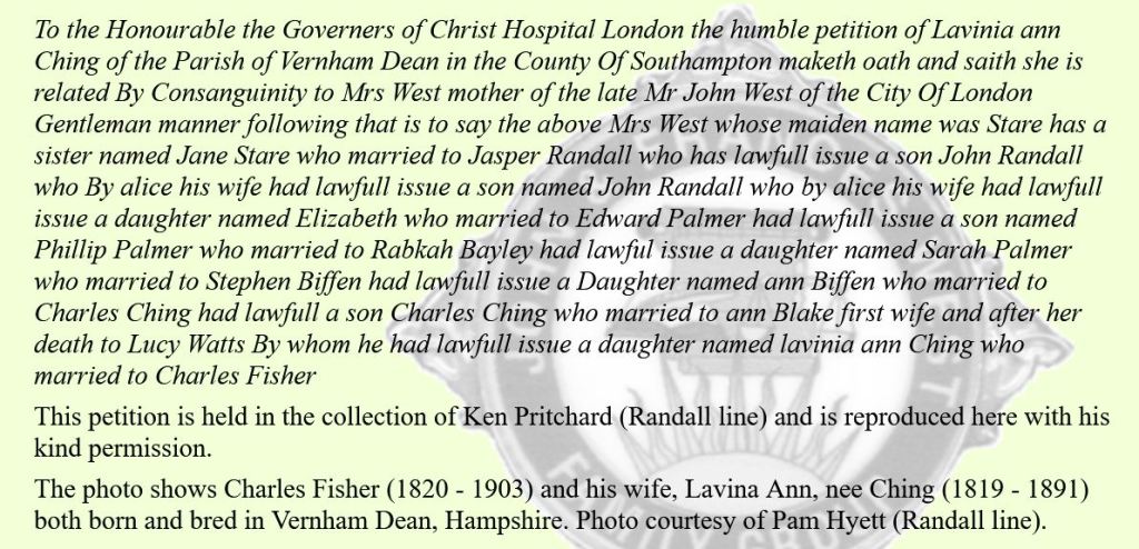 Membership of the John and Francis West Family Group is open to those who can demonstrate the common ancestor relationship. One of the aims of the group is to further genealogical information that they hold in their pedigrees, Certainly coming across the petition by Lavinia Ching helped me to further my understanding of the CHING Family in Hampshire.