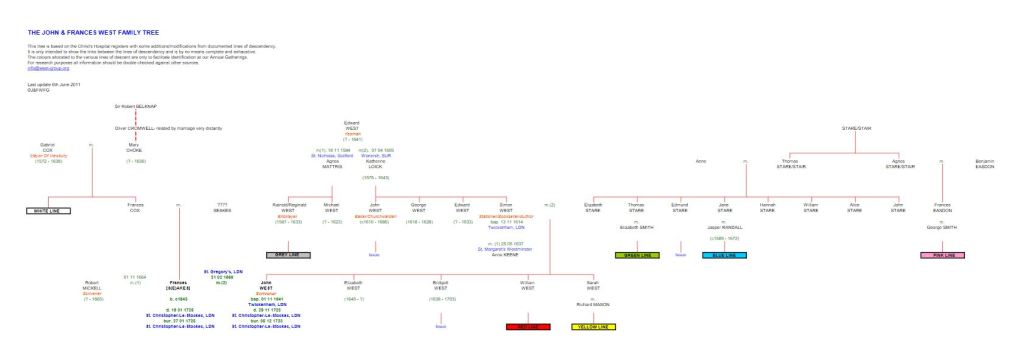 Information on John and Francis West can be found on the website: http://www.west-group.org/index.html. John West was a scrivener in London in the early 1700’s. He and his wife Francis are mostly known for the charitable bequests that they established. John born in 1641 was the son of Simon WEST and Elizabeth STARE (STAIR). John and Francis West did not have any children of their own, and must have amassed a large fortune. Through trusts administered by the Clothworkers Company and Christ’s Hospital (a school). The blind and kin were identified to benefit from these trusts and indentures. Today the Christ’s Hospital administers the Kin of John and Frances West trust, while the Clothworkers Foundation administers the West Relief in Need of Charity. The GIBBS / CHING Family are kin of Frances West nee STARE through her sister Elizabeth STARE. Or through the blue line on the pedigree below.